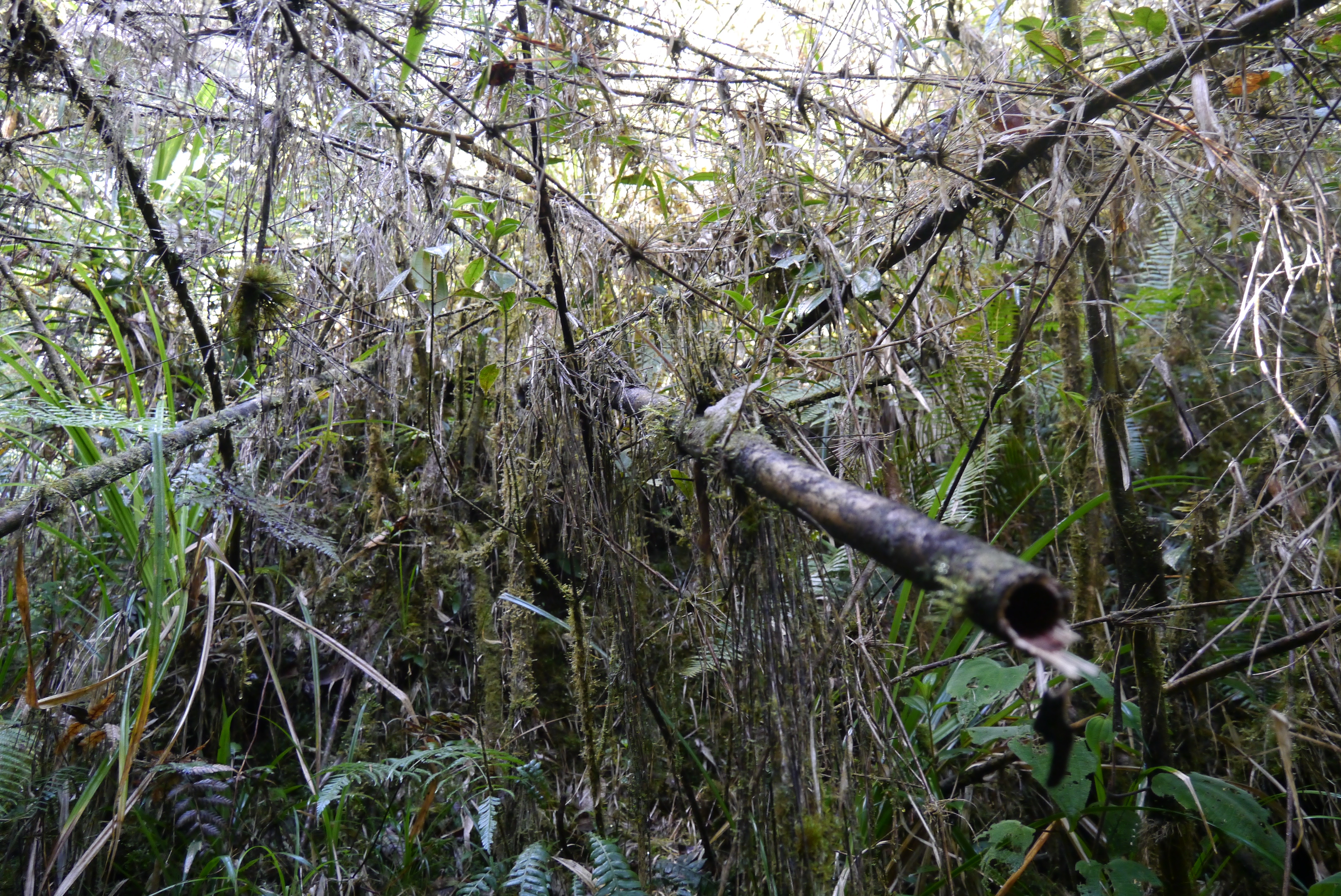 ESP: Después de seis años regresé a Chuspipata, que se encuentra en las partes altas de los Yungas de La Paz a 3000 metros sobre el nivel del mar. Chuspipata es una de las regiones reconocidas de recolección de tuquru paceño (Aulonemia hirtula) en los Yungas Centrales del Departamento de La Paz. Mis amigos luriris me contaban que los bosques nublados de Chuspipata dejaron de proveer materiales, ya que las poblaciones de tuquru fueron sobreexplotadas en las últimas décadas debido a que Chuspipata es un sitio de recolección muy accesible y cercano a la ciudad de La Paz. Hace seis años, como parte de mi trabajo de campo para mi tesis doctoral, fui a Chuspipata con el fin de realizar entrevistas con comunarios y ver qué había pasado con estos tuqurus paceños. Los lugareños me dijeron en 2018 que el comercio de tuquru con los luriris seguía vivo en la primera década del siglo XXI, pero que disminuyó sucesivamente a lo largo de los años debido a la escasez de materiales. Al revisar los lugares de recolección en los bosques nubosos en Chuspipata, encontré poblaciones en descomposición que florecieron de forma gregaria y pusieron semillas a principios de 2018. Bajo los culmos podridos ya crecían nuevas plántulas, lo que me dio la impresión de una población sostenible y resistente que probablemente proporcionará nuevos materiales maduros en los próximos años. Me sorprendió volver el domingo pasado al mismo lugar y ver que ni una sola plántula se había convertido en planta adulta. En cambio, otros bambúes andinos como la k’urkura (Chusquea sp.), que no son adecuados para fabricar flautas porque tienen entrenudos sólidos, colonizaron rápidamente el espacio forestal que se abrió por la descomposición colectiva de los tuqurus. Curiosamente, encontré otra población juvenil no lejos de mi lugar conocido. Estas poblaciones aún necesitan crecer otros seis años más para proporcionar materiales maduros en el futuro. Este ejemplo demuestra que la competencia ecológica por las localidades adecuadas entre las diferentes especies de bambúes andinos que comparten el mismo hábitat natural puede ser una de las razones de los cambios en la dinámica de las poblaciones y de la interrupción de los ciclos de reproducción de los bambúes musicales. Sin embargo, también volví a hablar con algunos miembros de la comunidad de Chuspipata y me repitieron lo que me contaron los luriris hace seis años. Cuando los tuqurusestaban maduros y proporcionaban buenos materiales, los lugareños recogían culmos y los vendían a los fabricantes de flautas para aprovechar la fuente adicional de ingresos económicos. Desde ese momento, los tuqurus ya no se reproducen en los lugares conocidos como lo hacían antes. Esto indica que también se deben considerar métodos de recolección más sostenibles en este lugar específico, especialmente cuando se quiere introducir las prácticas de recolección en el plan de manejo del Parque Nacional y Área Natural de Manejo Integrado (PN y ANMI) Cotapata.