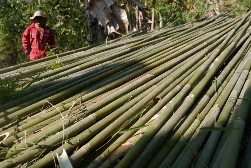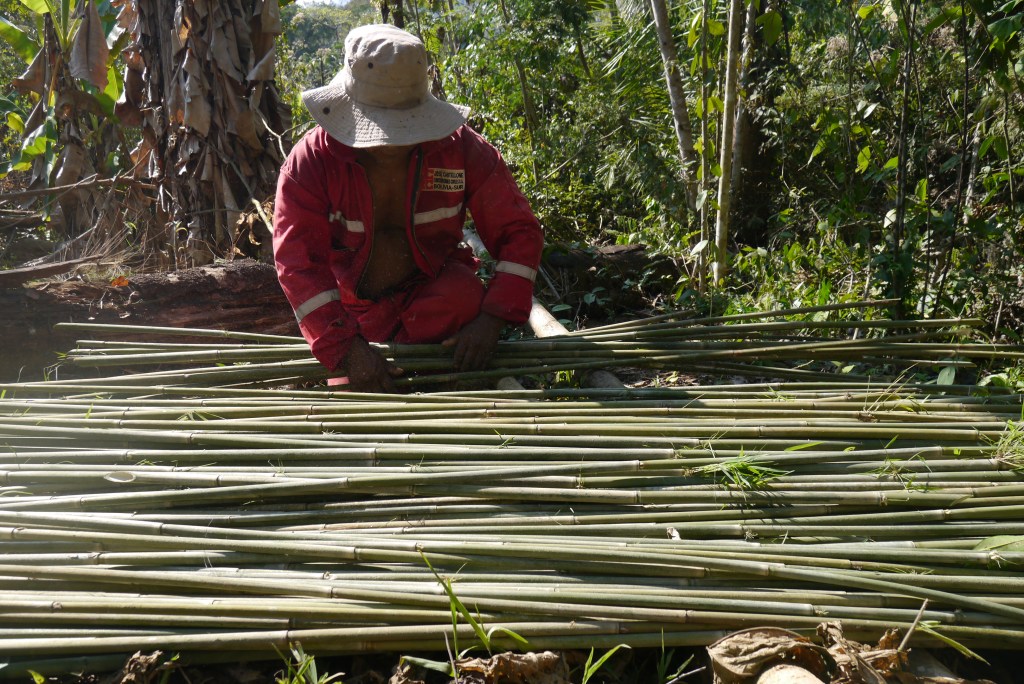 ENG: Alto Beni is not only one of the municipalities of Caranavi province (La Paz department) but also defines a natural geographic area (broader ecoregion), partially integrated within the departments of La Paz, Cochabamba, and Beni. It is situated in the syncline valley of the mid-course of the Beni River (called Alto Beni or Mosetén River) in the Andean-Amazonian piedmont or foothills. What is commonly known as ‘chhalla de Alto Beni’ is actually two different variants (lluq’a and qipu type), growing in distinct areas in the Alto Beni region. The lluq’a variant is sourced on the left side of the Beni River around San Antonio and towards San José in the southeast part of the declared Mosetén Indigenous territory (sp. Tierra Comunitaria de Origin or simply TCO), while the qipu variant grows on the right side of the Beni River towards Inicua Bajo in the northwest part of the Mosetén TCO. Both have distinct ecological life cycles suggesting that they are two different bamboo species. In 2018, I accompanied the chhallero René Condori during harvest of the qipu chhalla type. Before we started collecting, René initially instructed me how to recognise mature culms and cut them correctly. This very experienced chhallero explained to me that mature culms change colour from bright and shiny green into a darker green and later yellowish/grey tone. Once in the rainforest, with chhalla clumps in front of us, he pointed out the mature culms to be collected. These were situated in the centre of the clumps, while young and premature lignifying culms were growing towards its periphery. Depending on the distribution of culms, it was sometimes difficult to reach the centre without damaging younger culms in the periphery. I observed how René managed to cut a tunnel-like entrance into the clump and removed mature culms from the centre. He even left behind some mature or overaged culms, so that soft immature and lignifying ones on the periphery do not collapse. René further stated that mature culms should be cut from the first or second node onwards, counting four or five successive internodes. This is the standard length of traded chhalla bamboo culms, which facilitates counting internodes in the traded bundle (ay. qhiwi). These qhiwis, a word which derives from the Aymara verb qhiwiña meaning ‘to carry a large and heavy thing over the shoulder’, consist of 300 culms that each have four or five internodes. As tuquru tubes are longer and additionally sold per unit (not in a bundle), tuquru bamboos are usually cut per internode. Both chhalla and tuquru internodes are cut above the nodes since makers use internodes from the node downwards, with the node becoming the flute’s foot joint. The part of the culm leaves is moister and softer and therefore not suitable for the flute’s foot joint. Natural clumps are sometimes extremely congested with tangled up culms under extreme tension. This frequently produces dangerous situations, and care must be taken not to be injured by sharp-edged culms whipping back after being cut. It was very important to have an extremely sharp machete blade, so we had to sharpen it continuously. We removed all branches and leaves from the collected culms and brought them to a half-shaded place at the forest edge, leaning them out on a collapsed tree trunk for drying so that culms do not become rotten on the moist forest floor. What I learnt from René was that it is fundamental not to clear cut clumps because younger shoots are continuously growing from the rhizome and lignifying (vegetative growth/reproduction). He said that, within certain intervals, chhalla bamboos can be gathered from the same clump over several years (the stability phase), if done correctly. René usually works more frequently during the dry season, and only opportunistically over the rainy season, when weather allows for it. He said that chhalla bamboos regenerate over the rainy season and more care must be taken during collection. Additionally, chhalla bamboos would be more infested by insects, fungi, and borers, which is scientifically linked to higher starch (sugar) contents over the rainy season. In fact, his low-invasive and selective modes of chhalla collection introduced above must also be linked to his livelihood strategy. He would never clear cut chhalla clumps, as these are the material basis for his future economic wellbeing. Instead, he interprets the rapid expansion of the agricultural frontier and the destruction of chhalla habitats in Alto Beni as a major threat to his work. He is already in constant search of new chhalla populations, since year after year known sourcing sites are burned down. Around intercultural communities (like San Antonio, Boopi or Puerto Carmen) on the west side of the Beni River, where lluq’a chhalla bamboos are sourced, old-growth forests have largely been cut down and burned as part of the slash-and-burn agriculture. Intercultural settlers prepare the forest by cutting down undergrowth (slash), which they leave to dry for several weeks. They often do not allow chhalla bamboo collecting, as they use the dried chhalla culms as part of the slash, which they later burn to produce the swidden with nutrient-rich layers of ash, making the soil temporarily fertile. I have experienced such a forest fire in Alto Beni myself, which rapidly spread and developed huge fountains of fire of about 10 to 15 metres high, reaching over the tree-tops of the pre-Andean Amazonian forest. In fact, chhalla is used as a natural fire accelerant.