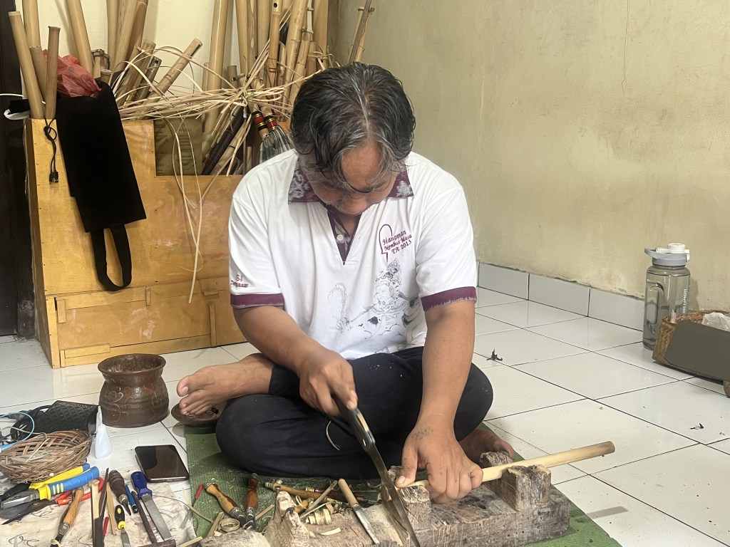 The bamboo for suling is harvested during the dry season, when it is less prone to cracking, rotting, and insect infestation. The exact period for harvesting is governed by the Balinese calendar system (wariga), which indicates which days are auspicious and which periods must be avoided. After the bamboo is harvested by farmers with machetes, the bamboo is purchased by suling makers. There are two main steps in crafting the suling. First is the drying process, where makers select bamboo of the correct size and dry them for months sometimes even years. The second step is the crafting of the suling. Using small knives and drills, the makers cut the holes and craft the mouthpieces. They tune the suling precisely to the tuning of the gamelan (traditional orchestra) that it is expected to accompany. Additionally, the suling are given decorations made from stickers, turtle shells, and sometimes silver.