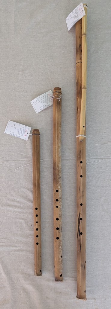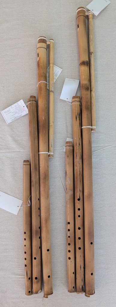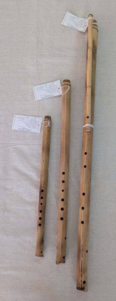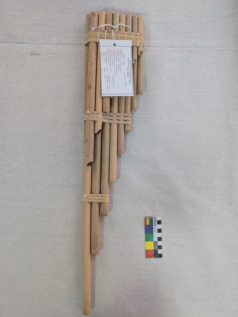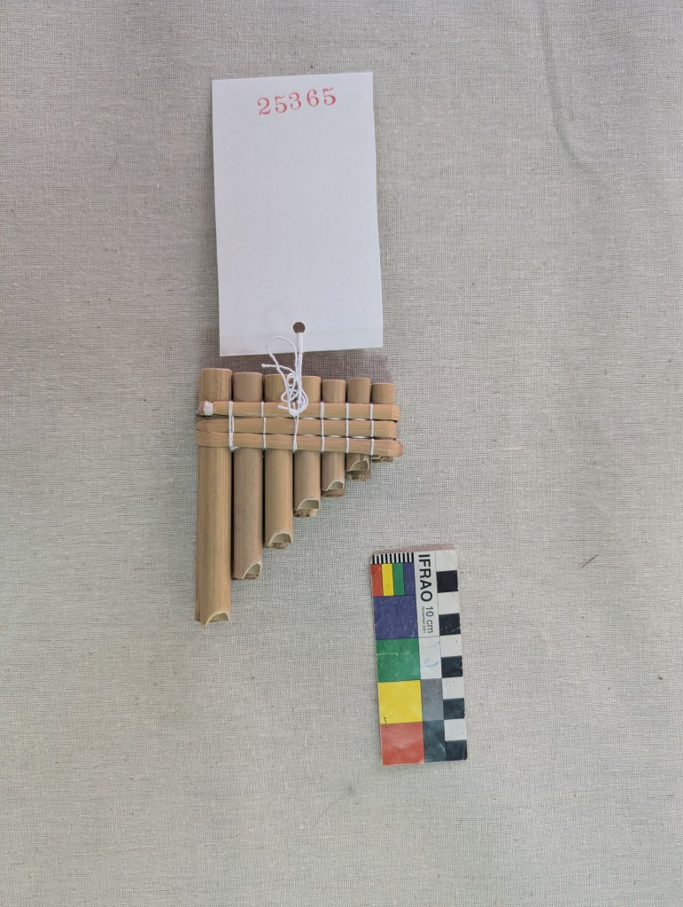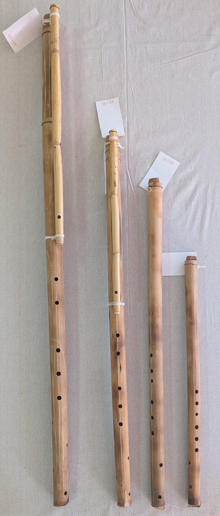 ENG: In March, I reviewed some bamboo flutes from the collection at the Museo Nacional de Etnografía y Folklore (MUSEF) in La Paz. I examined several qantu phukuna and jach’a sikuri panpipes that were crafted in December 2007 by a luriri from Walata Grande, who used the renowned chhalla from the Zongo Valley. Some of the tubes show signs of decomposition. Assuming that the chhalla was collected and transformed into sikus in the same year, this suggests that the plant was near decomposition around 2008 or 2009. This aligns with the data gathered during my fieldwork in 2018 and 2024. In 2018, I saw the chhalla de Zongo in a juvenile state, which likely experienced decomposition earlier around 2015 or 2016. By 2024, these plants had matured and were once again beginning to decompose. According to the luriris and chhalleros, the chhalla de Zongo has a life cycle of approximately 7 to 8 years. The musiñu flutes I reviewed, also made in 2007 by an unknown artisan from Walata Grande, were predominantly crafted with lluq’a paceño tuquru, found in the southern La Paz yungas near Choquetanga. Locals refer to this bamboo as “fina,” or fine tuquru. According to Ignacio Quispe, a master luriri and specialist in musiñu, this is one of the most suitable types of tuquru for crafting musiñus, although it is now an extremely rare material. Some tubes feature beautiful black marks known as “lunarejo” by the luriris. Some salliwas (with palltjatas made from suqusa cane) were made from a single tuquru internode. Nowadays, some tuqureros do not allow the tuqurus to develop culms with such long basal internodes, as they prefer to harvest shorter internodes used for tourist flutes.