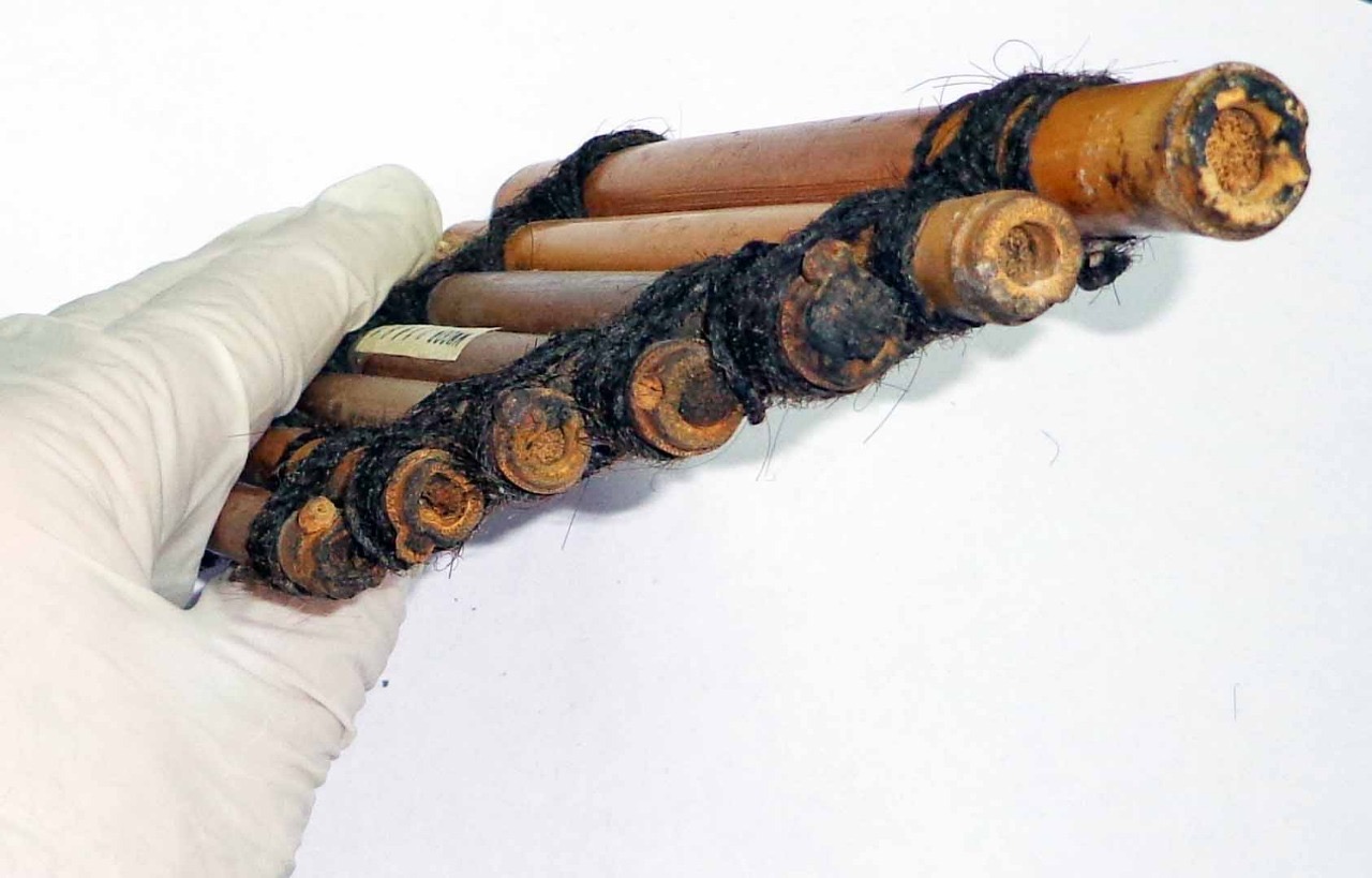 Me gustaría añadir la siguiente actualización a esta discusión, que encuentro extremadamente interesante con respecto al uso de bambúes leñosos andinos nativos en la fabricación de flautas prehispánicas. El Museo de Bellas Artes de Boston (EE.UU.) posee un siku arqueológico particular en su colección “Oro precolombino y civilizaciones andinas” (aquí), que está claramente hecha de bambúes leñosos nativos del género Rhipidocladum (ahora llamados por los aymaras como chhalla, un término utilizado desde tiempos prehispánicos). El siku está descontextualizado (“cultura desconocida”) pero se ha datado presumiblemente después del año 1600 d.C. Sin embargo, muestra algunas características de sikus prehispánicos. Por ejemplo, la primera fila posiblemente tiene nudos de bambú perforados en su extremo distal, tapados con tapones de calabaza, similares a los encontrados en las tierras altas bolivianas, y en otros lados. Esta es una técnica de elaboración muy extendida en los sikus prehispánicos, lo cual es curioso porque los fabricantes de sikus contemporáneos utilizan los nudos de las chhallas como tapones naturales para los tubos resonadores (vean mi discusión en mi artículo). ¿Se perforaron estos nudos para controlar mejor las propiedades acústicas del bambú y los sonidos que producen cuando se tocan colectivamente? ¿O ha jugado la calabaza una función ritual importante? La segunda fila de este siku particular es, sin embargo, mucho más intrigante desde una perspectiva de los bambúes musicales. La segunda fila, que se desarrolló en el Período Formativo Tardío, y se extendió durante el Horizonte Medio y el Período Intermedio Tardío, hoy en día se refiere a menudo como “resonadores”. Sin embargo, hablando acústicamente, los tubos secundarios (pallq’as) son más precisamente modificadores del timbre (vean el capítulo de Arnaud Gérard 2018 aquí), que, en este caso, presentan cortes cuadrados ampliamente distribuidos de sikus arqueológicos. Gérard (2018 [mi traducción]) escribe: “En realidad la función del tajo biselado (o cuadrado) en el extremo distal de los tubos pallqas de la segunda hilera tiene por función de acortar la longitud acústica del tubo secundario comparada con la longitud delantera (¡en las siringas precolombinas eran por lo general cuadrados). Su efecto acústico es más bien aproximar más esa nota a la octava de la primera hilera que alejarla. Esto es debido a una corrección por la influencia del diámetro del tubo en la altura de sonido.” Sin embargo, el aspecto más interesante de este siku es que los tubos de chhalla están colocados con sus nudos hacia el extremo proximal; en otras palabras, “al revés” desde la perspectiva de las prácticas contemporáneas de contrucción de sikus. En una comunicación personal, el arqueólogo musical José Pérez de Arce sugiere que esto podría ser una forma de mejorar su función como un incrementador del espectro tímbrico descrito por Gérard (2018). Gérard (2018) muestra que estos tubos invertidos no están cerrados, sino que son semi o parcialmente abiertos, ya que a menudo tienen pequeños orificios junto a las obturaciones (nudos). Por lo tanto, producirían sonidos de manera indirecta, añadiendo armónicos adicionales. Sin embargo, no se sabe cómo se tocaban, y en general se necesita mucha más investigación en el campo de la acústica musical. El siku está atada con un hilo, que tiene un nudo de chhalla en su extremo trenzado. ¿Podría ser este un tapón adicional que el sikuri usó para tapar los tubos individuales mientras tocaba?