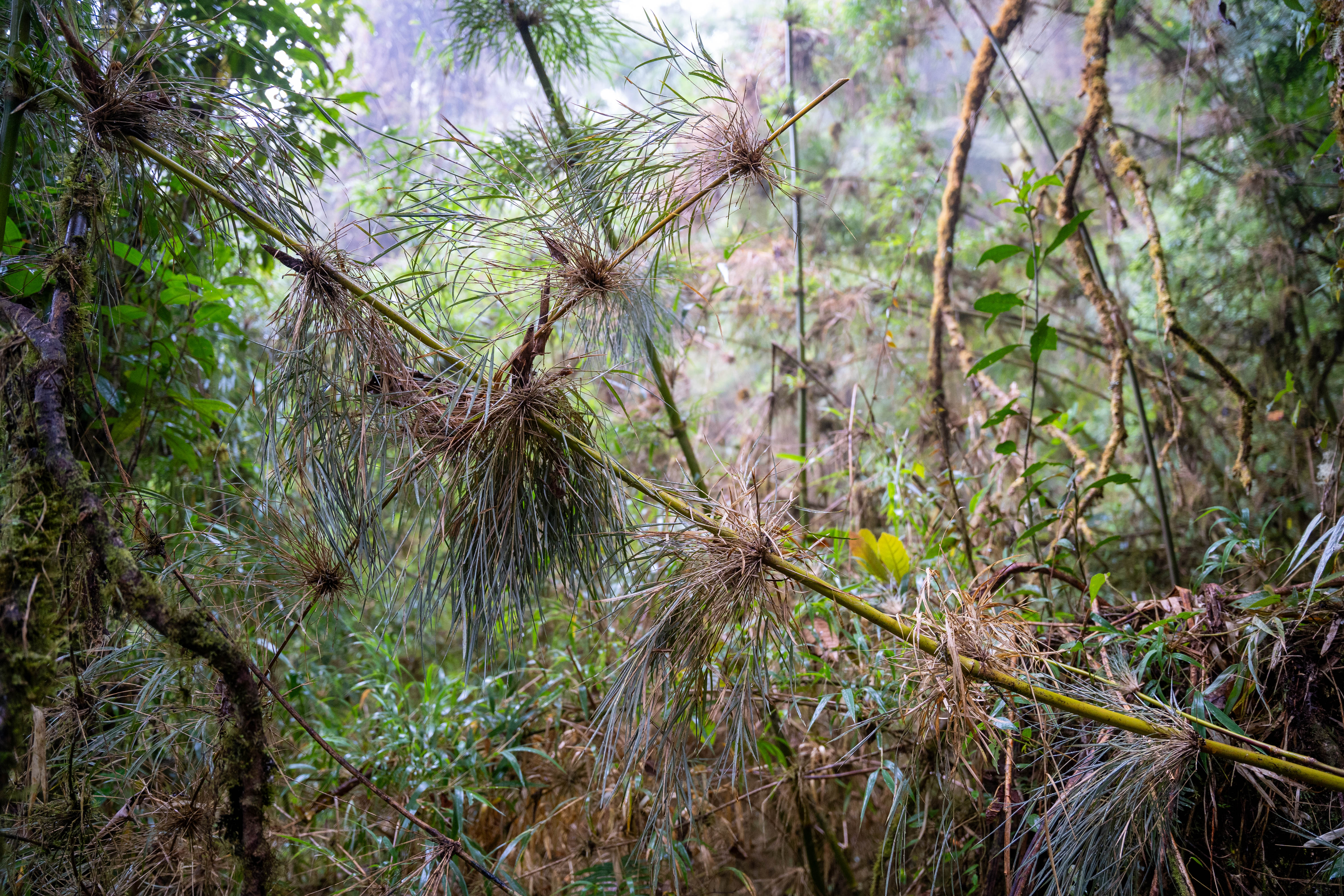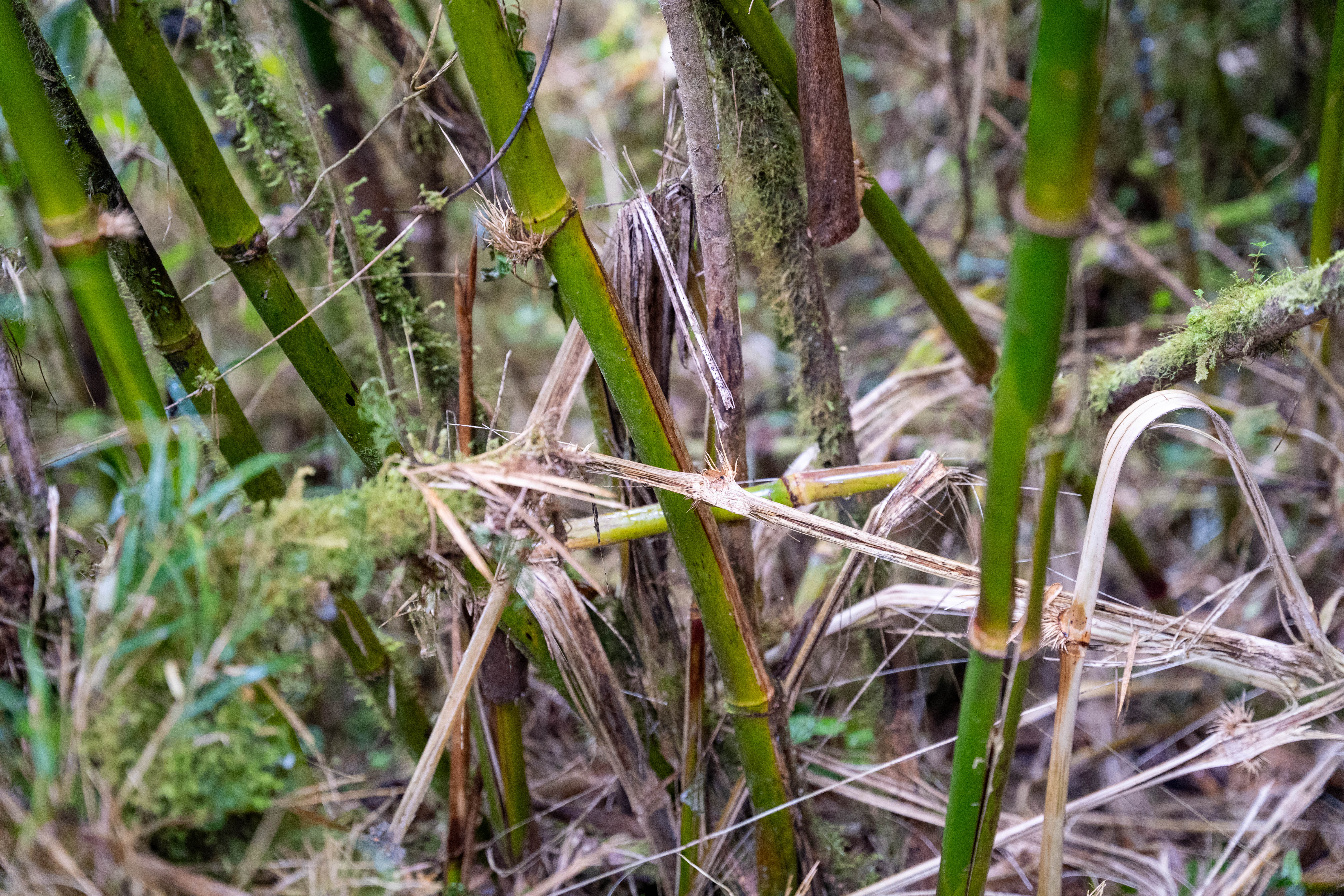 El oso andino mantiene una relación muy estrecha con los bambúes leñosos del género Chusquea, que son una fuente importante de alimento en los bosques nublados. Los osos consumen principalmente los brotes tiernos y las cañas, que aprovechan en grandes cantidades para suplementar su dieta, especialmente en épocas en las que hay menor disponibilidad de frutos u otros recursos vegetales. Durante nuestros monitoreos con cámaras trampa, hemos registrado varios osos alimentándose intensamente dentro de densos parches de bambú, donde dejan marcas, senderos y restos de cañas mordidas, evidenciando su uso frecuente de estos sitios. Esta relación también tiene un papel ecológico más amplio. Al desplazarse por los bambuzales y alimentarse de diferentes especies vegetales, los osos contribuyen a la dispersión de semillas de especies de árboles, ayudando a mantener la regeneración natural del bosque y su diversidad biológica.